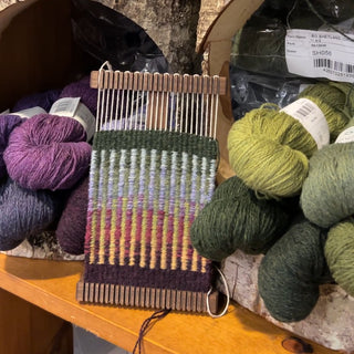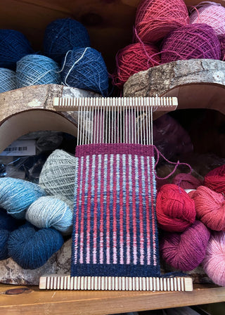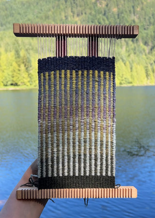 These two gradient bundles of Bio Shetland are both dynamic gradients, offering painterly effect to the colour transitions. Woven on a walnut Everlea Mini Loom, this is as compact as a weaving project gets.
